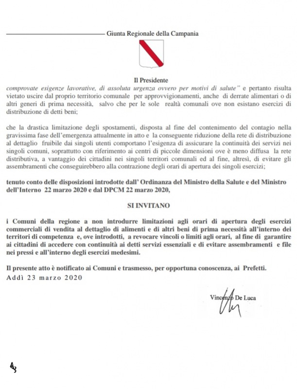 Questo il documento emanato dalla Regiona Campania: