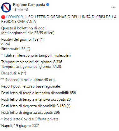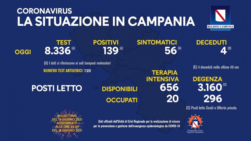 Questo il post pubblicato sulla pagina Facebook 'Regione Campania': "Covid 19 IL BOLLETTINO ORDINARIO DELL'UNITÀ DI CRISI DELLA REGIONE CAMPANIA Questo il bollettino di oggi: (dati aggiornati alle 23.59 di ieri) Positivi del giorno: 139 (*) di cui Sintomatici: 56 (*) * I dati si riferiscono ai tamponi molecolari Tamponi molecolari del giorno: 8.336 Tamponi antigenici del giorno - si legge nel post - 7.120 Deceduti: 4 (**) ** 4 deceduti nelle ultime 48 ore. Report posti letto su base regionale: Posti letto di terapia intensiva disponibili: 656 Posti letto di terapia intensiva occupati: 20 Posti letto di degenza - si legge ancora - disponibili: 3.160 (*) Posti letto di degenza occupati: 296 * Posti letto Covid e Offerta privata. Napoli, 19 giugno 2021".