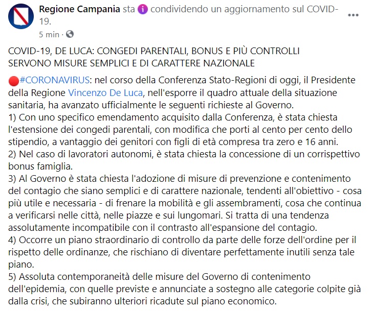 Questo quanto pubblicato sulla pagina facebook della Regione Campania: