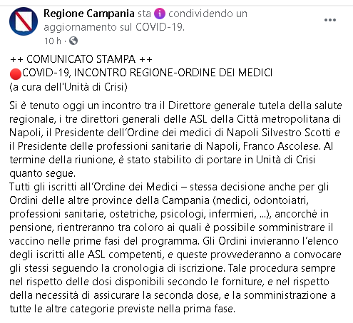 Lo apprendiamo dalla pagina Facebook della Regione Campania.