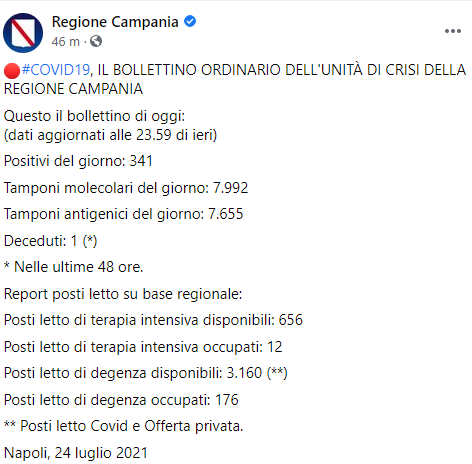 Questo il post pubblicato sulla pagina Facebook 'Regione Campania': "Covid-19: IL BOLLETTINO ORDINARIO DELL'UNITÀ DI CRISI DELLA REGIONE CAMPANIA. Questo il bollettino di oggi: (dati aggiornati alle 23.59 di ieri) Positivi del giorno: 341 Tamponi molecolari del giorno: 7.992 - si legge nel post - Tamponi antigenici del giorno: 7.655 Deceduti: 1 (*) * Nelle ultime 48 ore. Report posti letto su base regionale: Posti letto di terapia intensiva disponibili: 656 Posti letto - prosegue il post - di terapia intensiva occupati: 12 Posti letto di degenza disponibili: 3.160 (**) Posti letto di degenza occupati: 176 ** Posti letto Covid e Offerta privata". Napoli, 24 luglio%u200B 2021".