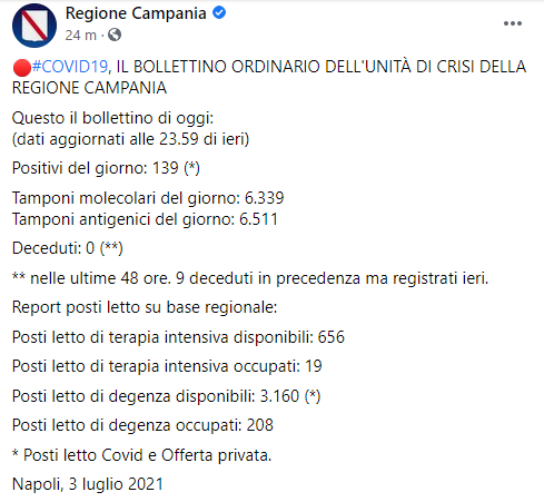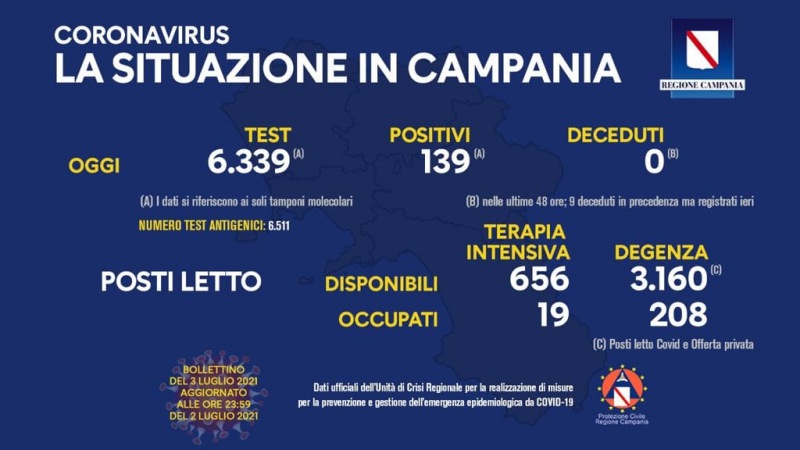 Questo il post pubblicato sulla pagina Facebook 'Regione Campania': "Covid-19. IL BOLLETTINO ORDINARIO DELL'UNITÀ DI CRISI DELLA REGIONE CAMPANIA Questo - si legge nel post - il bollettino di oggi: (dati aggiornati alle 23.59 di ieri) Positivi del giorno: 139 (*) Tamponi molecolari del giorno: 6.339 Tamponi antigenici - si legge nel post - del giorno: 6.511 Deceduti: 0 (**) ** nelle ultime 48 ore. 9 deceduti in precedenza ma registrati ieri. Report - si legge ancora - posti letto su base regionale: Posti letto di terapia intensiva disponibili: 656 Posti letto di terapia intensiva occupati: 19 Posti letto di degenza disponibili: 3.160 (*) Posti letto di degenza occupati: 208 * Posti letto Covid - conclude il post - e Offerta privata. Napoli, 3 luglio%u200B 2021".