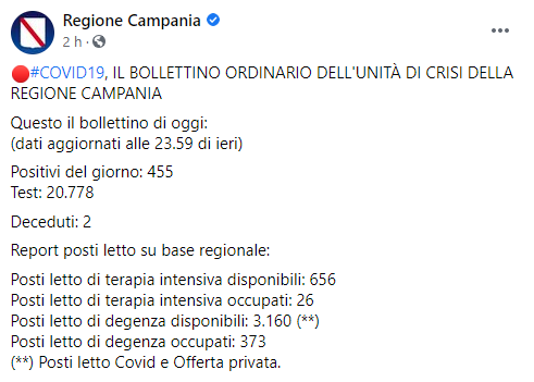 Questo il post pubblicato sulla pagina Facebook 'Regione Campania': "Covid-19 IL BOLLETTINO ORDINARIO DELL'UNITÀ DI CRISI DELLA REGIONE CAMPANIA. Questo il bollettino di oggi: (dati aggiornati alle 23.59 di ieri) Positivi del giorno: 455 Test - si legge nel post - 20.778 Deceduti: 2 Report posti letto su base - si legge ancora - regionale: Posti letto di terapia intensiva disponibili: 656 Posti letto di terapia intensiva occupati: 26 Posti letto di degenza disponibili - prosegue il post - 3.160 (**). Posti letto di degenza occupati: 373 (**) Posti letto Covid e Offerta privata".