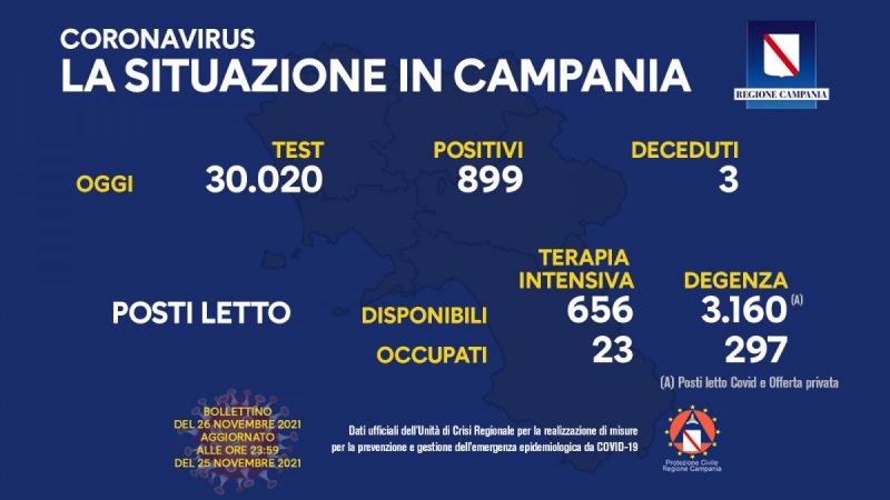 "Questo il bollettino di oggi: (dati aggiornati alle 23.59 di ieri) Positivi del giorno: 899 Test: 30.020 Deceduti: 3 Report posti letto su base regionale: Posti letto di terapia intensiva disponibili: 656 Posti letto di terapia intensiva occupati: -si legge nella nota- 23 Posti letto di degenza disponibili: 3.160 (*) Posti letto di degenza occupati: 297 (*) Posti letto Covid e Offerta privata. Napoli, 26 novembre 2021"