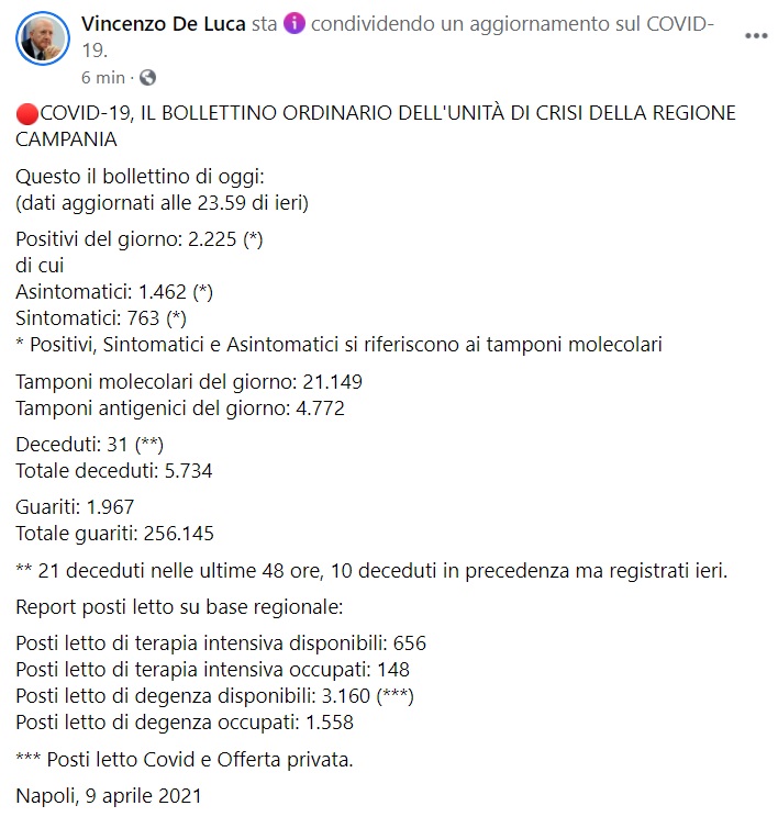 Questo quanto apprendiamo dalla pagina fb del Pres. De Luca: "COVID-19, IL BOLLETTINO ORDINARIO DELL'UNITÀ DI CRISI DELLA REGIONE CAMPANIA Questo il bollettino di oggi: (dati aggiornati alle 23.59 di ieri) Positivi del giorno: 2.225 (*) di cui Asintomatici: 1.462 (*) Sintomatici: 763 (*) * Positivi, Sintomatici e Asintomatici si riferiscono ai tamponi molecolari Tamponi molecolari del giorno: 21.149 Tamponi antigenici del giorno: 4.772 Deceduti: 31 (**) Totale deceduti: 5.734 Guariti: 1.967 Totale guariti: 256.145 ** 21 deceduti nelle ultime 48 ore, 10 deceduti in precedenza ma registrati ieri. Report posti letto su base regionale: Posti letto di terapia intensiva disponibili: 656 Posti letto di terapia intensiva occupati: 148 Posti letto di degenza disponibili: 3.160 (***) Posti letto di degenza occupati: 1.558 *** Posti letto Covid e Offerta privata. Napoli, 9 aprile 2021"