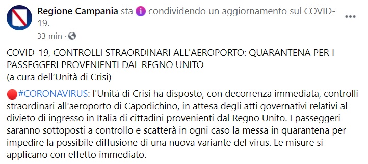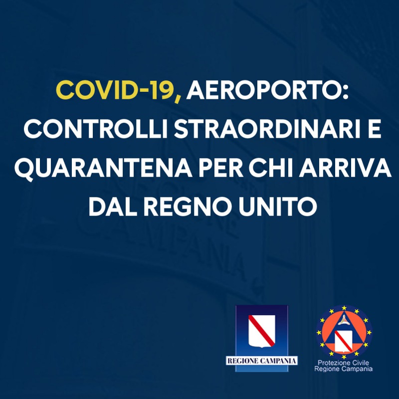 CAMPANIA. COVID. "CONTROLLI STRAORDINARI ALL'AEROPORTO: QUARANTENA PER I PASSEGGERI PROVENIENTI DAL REGNO UNITO"