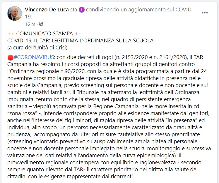 Questo quanto pubblicato sulla pagina fb del presidente De Luca