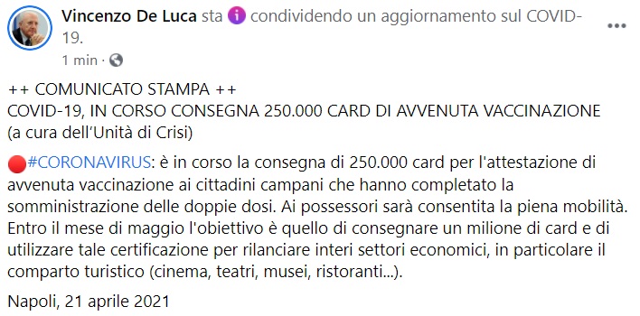 "++ COMUNICATO STAMPA ++ COVID-19, IN CORSO CONSEGNA 250.000 CARD DI AVVENUTA VACCINAZIONE (a cura dell’Unità di Crisi). #CORONAVIRUS: è in corso la consegna di 250.000 card per l'attestazione di avvenuta vaccinazione ai cittadini campani che- si legge nella nota- hanno completato la somministrazione delle doppie dosi. Ai possessori sarà consentita la piena mobilità. Entro il mese di maggio l'obiettivo è quello di consegnare un milione di card e di utilizzare tale certificazione per rilanciare interi settori economici, in particolare il comparto turistico (cinema, teatri, musei, ristoranti...)."