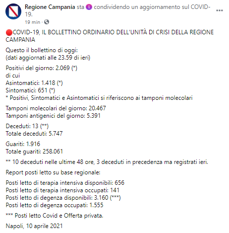 Posti letto di terapia intensiva disponibili: 656. Posti letto - prosegue il post - di terapia intensiva occupati: 141 Posti letto di degenza disponibili: 3.160 (***) Posti letto di degenza occupati: 1.555 *** Posti letto Covid - conclude il post - e Offerta privata. Napoli, 10 aprile 2021".