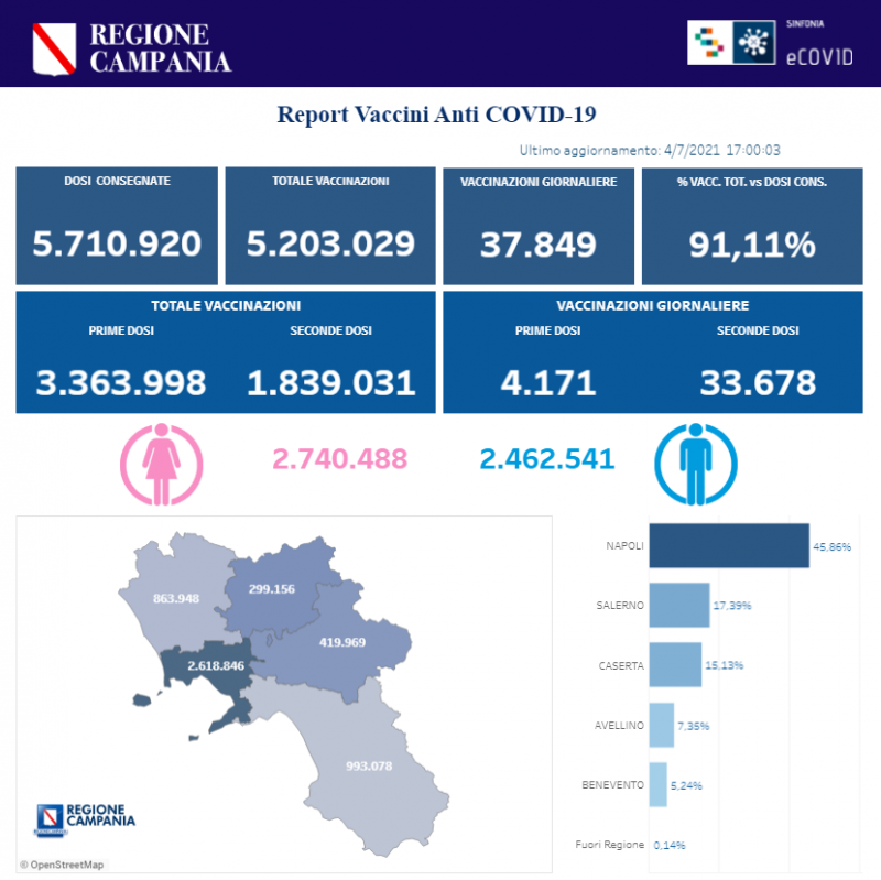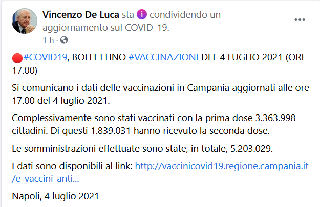 Questo quanto apprendiamo dalla pagina Facebook del Governatore Vincenzo De Luca: "COVID19, BOLLETTINO VACCINAZIONI DEL 4 LUGLIO 2021 (ORE 17.00). Si comunicano - si legge nel post - i dati delle vaccinazioni in Campania aggiornati alle ore 17.00 del 4 luglio 2021. Complessivamente sono stati vaccinati - prosegue il post - con la prima dose 3.363.998 cittadini. Di questi 1.839.031 hanno ricevuto la seconda dose. Le somministrazioni effettuate sono state, in totale, 5.203.029. I dati sono disponibili al link CLICCA QUI".
