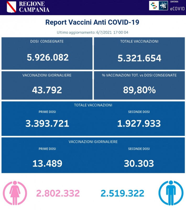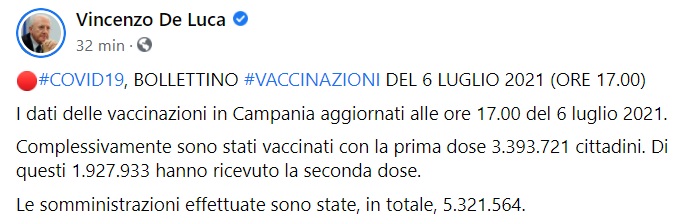 Questo quanto apprendiamo dalla pagina fb del Pres. De Luca: "COVID19, BOLLETTINO #VACCINAZIONI DEL 6 LUGLIO 2021 (ORE 17.00) I dati delle vaccinazioni in Campania aggiornati alle ore 17.00 del 6 luglio 2021. Complessivamente sono stati vaccinati con la prima dose 3.393.721 cittadini. Di questi 1.927.933 hanno ricevuto la seconda dose. Le somministrazioni effettuate sono state, in totale, 5.321.564."