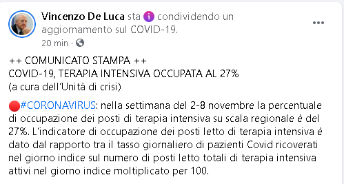 Lo apprendiamo dalla pagina Facebook di Vincenzo De Luca, Presidente della Regione Campania.