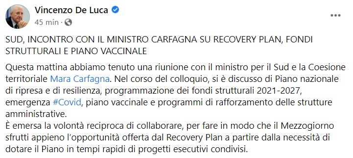 "SUD, INCONTRO CON IL MINISTRO CARFAGNA SU RECOVERY PLAN, FONDI STRUTTURALI E PIANO VACCINALE. Questa mattina abbiamo tenuto una riunione con il ministro per il Sud e la Coesione territoriale Mara Carfagna. Nel corso del colloquio, si è discusso- si legge nella nota- di Piano nazionale di ripresa e di resilienza, programmazione dei fondi strutturali 2021-2027, emergenza #Covid, piano vaccinale e programmi di rafforzamento delle strutture amministrative. È emersa la volontà reciproca di collaborare, per fare in modo che il Mezzogiorno sfrutti appieno l’opportunità- si legge nella nota- offerta dal Recovery Plan a partire dalla necessità di dotare il Piano in tempi rapidi di progetti esecutivi condivisi."
