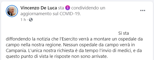 Questo quanto pubblicato sulla pagina fb del Presidente De Luca