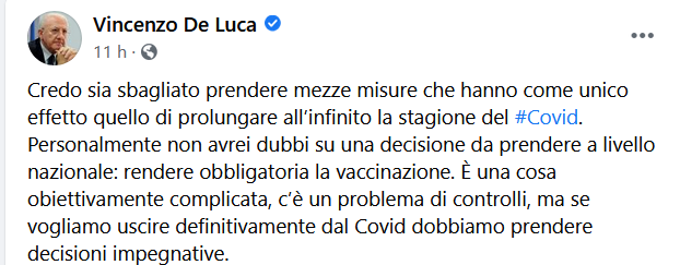 Questo il post pubblicato dal Governatore della Campania, Vincenzo De Luca: "Credo sia sbagliato prendere mezze misure che hanno come unico effetto quello di prolungare all’infinito la stagione del Covid. Personalmente non avrei dubbi su una decisione da prendere a livello nazionale: rendere obbligatoria la vaccinazione. È una cosa obiettivamente complicata - recita il post - c’è un problema di controlli, ma se vogliamo uscire definitivamente dal Covid dobbiamo prendere decisioni impegnative".