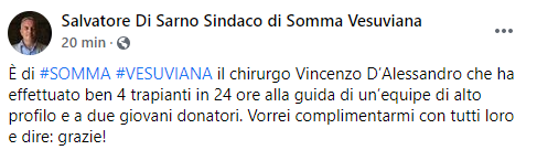 Questo il post pubblicato sulla sua pagina Facebook dal Sindaco di Somma Vesuviana Salvatore Di Sarno: "È di Somma Vesuviana il chirurgo Vincenzo D’Alessandro - si legge nel post - che ha effettuato ben 4 trapianti in 24 ore alla guida di un’equipe di alto profilo e a due giovani donatori. Vorrei complimentarmi con tutti loro - conclude il post - e dire: grazie".