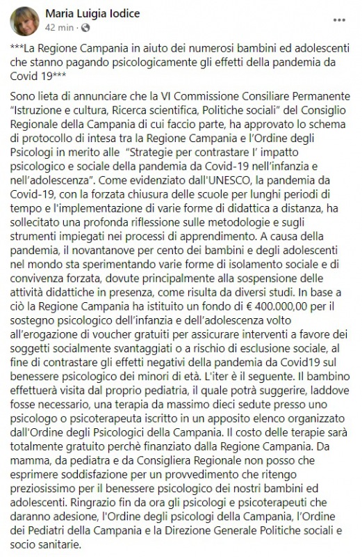 "Sono lieta di annunciare che la VI Commissione Consiliare Permanente “Istruzione e cultura, Ricerca scientifica, Politiche sociali” del Consiglio Regionale della Campania di cui faccio parte, ha approvato lo schema di protocollo di intesa tra la Regione Campania e l’Ordine degli Psicologi in merito alle “Strategie per contrastare I’ impatto psicologico e sociale della pandemia da Covid-19 nell’infanzia e nell’adolescenza”. -Si legge nella nota- Come evidenziato dall'UNESCO, la pandemia da Covid-19, con la forzata chiusura delle scuole per lunghi periodi di tempo e l'implementazione di varie forme di didattica a distanza, ha sollecitato una profonda riflessione sulle metodologie e sugli strumenti impiegati nei processi di apprendimento. A causa della pandemia, il novantanove per cento dei bambini e degli adolescenti nel mondo sta sperimentando varie forme di isolamento sociale e di convivenza forzata, dovute principalmente alla sospensione delle attività didattiche in presenza, come risulta da diversi studi. -Si legge nella nota- In base a ciò la Regione Campania ha istituito un fondo di € 400.000,00 per il sostegno psicologico dell’infanzia e dell’adolescenza volto all’erogazione di voucher gratuiti per assicurare interventi a favore dei soggetti socialmente svantaggiati o a rischio di esclusione sociale, al fine di contrastare gli effetti negativi della pandemia da Covid19 sul benessere psicologico dei minori di età. L'iter è il seguente. Il bambino effettuerà visita dal proprio pediatria, il quale potrà suggerire, laddove fosse necessario, una terapia da massimo dieci sedute presso uno psicologo o psicoterapeuta iscritto in un apposito elenco organizzato dall'Ordine degli Psicologici della Campania. -Si legge nella nota- Il costo delle terapie sarà totalmente gratuito perchè finanziato dalla Regione Campania. Da mamma, da pediatra e da Consigliera Regionale non posso che esprimere soddisfazione per un provvedimento che ritengo preziosissimo per il benessere psicologico dei nostri bambini ed adolescenti. Ringrazio fin da ora gli psicologi e psicoterapeuti che daranno adesione, l'Ordine degli psicologi della Campania, l’Ordine dei Pediatri della Campania e la Direzione Generale Politiche sociali e socio sanitarie."