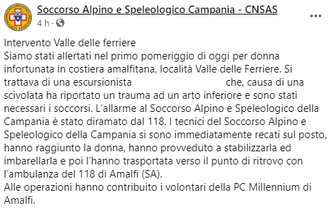 Questo parte del post pubblicato sulla pagina Facebook 'Soccorso Alpino e Speleologico della Campania CNSAS': "Intervento Valle delle ferriere Siamo stati allertati nel primo pomeriggio di oggi per donna infortunata in costiera amalfitana, località Valle delle Ferriere. Si trattava di una escursionista (...) che - si legge nel post - causa di una scivolata ha riportato un trauma ad un arto inferiore e sono stati necessari i soccorsi. L’allarme al Soccorso Alpino e Speleologico della Campania è stato diramato dal 118. I tecnici del Soccorso Alpino e Speleologico della Campania - prosegue il post - si sono immediatamente recati sul posto, hanno raggiunto la donna, hanno provveduto a stabilizzarla ed imbarellarla e poi l’hanno trasportata verso il punto di ritrovo con l’ambulanza del 118 di Amalfi (SA). Alle operazioni - conclude il post - hanno contribuito i volontari della PC Millennium di Amalfi".