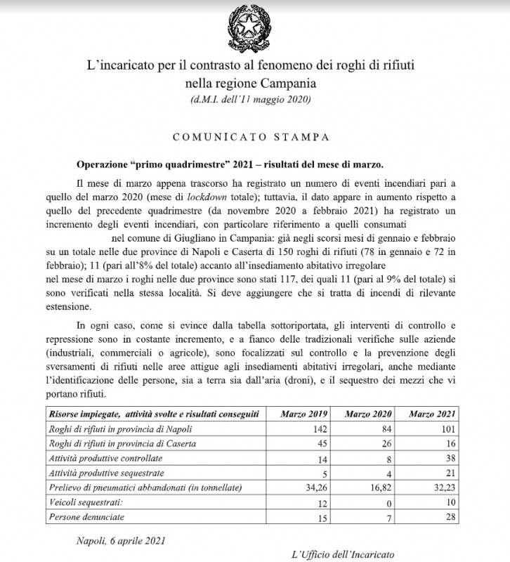 Questa parte della nota stampa dell'incaricato per il contrasto al fenomeno dei roghi di rifiuti nella regione Campania: