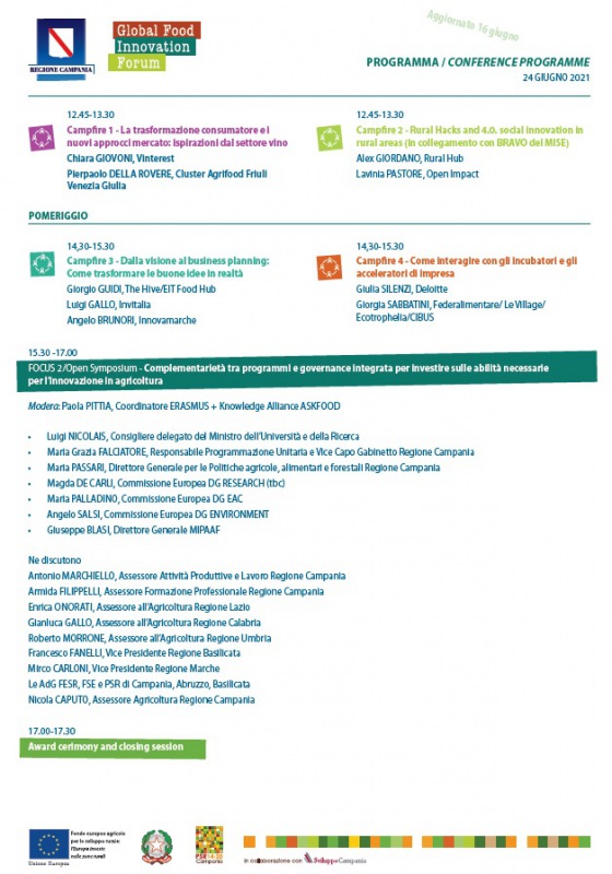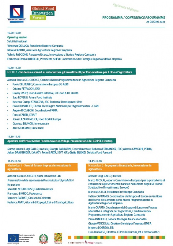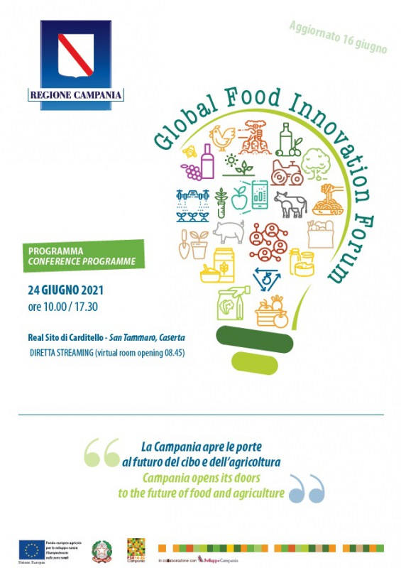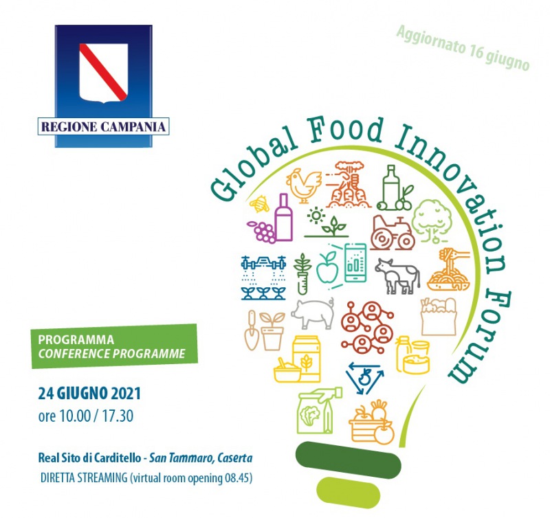 Giovedì 24 giugno si terrà l'evento "Global Food Innovation Forum", dalle ore 10:00 alle ore 17:00, presso il Real Sito di Carditello - San Tammaro (CE). Tanti gli ospiti che interverranno, tra cui ricordiamo il Pres. della Regione Campania Vincenzo De Luca, l'Ass. alla Agricoltura della Regione Campania Nicola Caputo, l'Ass. alla Ricerca, Innovazione e Startup della Regione Campania Valeria Fascione e il Pres. dell’VIII Commissione del Consiglio Regionale della Campania Francesco Emilio Borrelli.