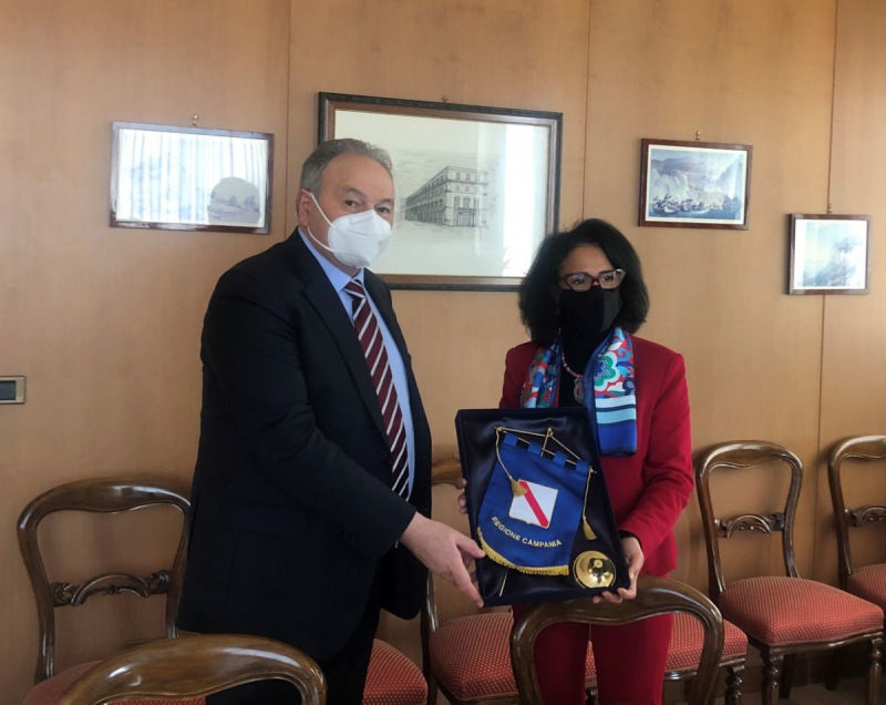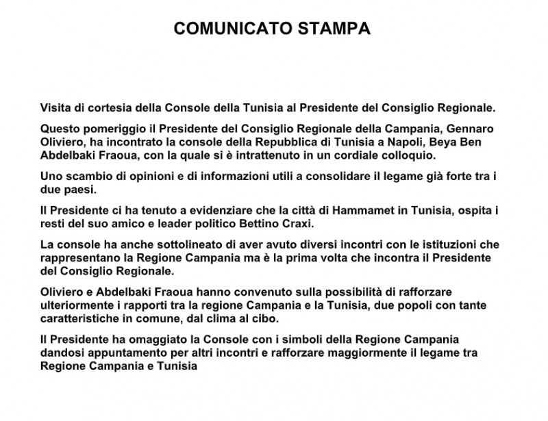 "Visita di cortesia della Console della Tunisia al Presidente del Consiglio Regionale. Questo pomeriggio il Presidente del Consiglio Regionale della Campania, Gennaro Oliviero, ha incontrato la console della Repubblica di Tunisia a Napoli, Beya Ben Abdelbaki Fraoua, con la quale- si legge nella nota- si è intrattenuto in un cordiale colloquio. Uno scambio di opinioni e di informazioni utili a consolidare il legame già forte tra i due paesi. Il Presidente ci ha tenuto a evidenziare che la città di Hammamet in Tunisia, ospita i resti del suo amico e leader politico Bettino Craxi. La console ha anche sottolineato di aver avuto diversi incontri con le istituzioni che rappresentano la Regione Campania ma è la prima volta che incontra il Presidente del Consiglio Regionale. Oliviero e Abdelbaki Fraoua hanno convenuto- si legge nel comunicato- sulla possibilità di rafforzare ulteriormente i rapporti tra la regione Campania e la Tunisia, due popoli con tante caratteristiche in comune, dal clima al cibo. Il Presidente ha omaggiato la Console con i simboli della Regione Campania dandosi appuntamento per altri incontri e rafforzare maggiormente il legame tra Regione Campania e Tunisia"