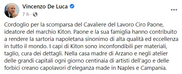 "Cordoglio per la scomparsa del Cavaliere del Lavoro Ciro Paone, ideatore del marchio Kiton. Paone e la sua famiglia hanno contribuito a rendere la sartoria napoletana sinonimo di alta qualità ed eccellenza in tutto il mondo. I capi di Kiton sono inconfondibili per materiali, taglio, cura dei dettagli. Nella casa madre di Arzano e negli atelier delle grandi capitali ogni giorno centinaia di artisti dell'ago e delle forbici creano capolavori d'eleganza made in Naples e Campania."