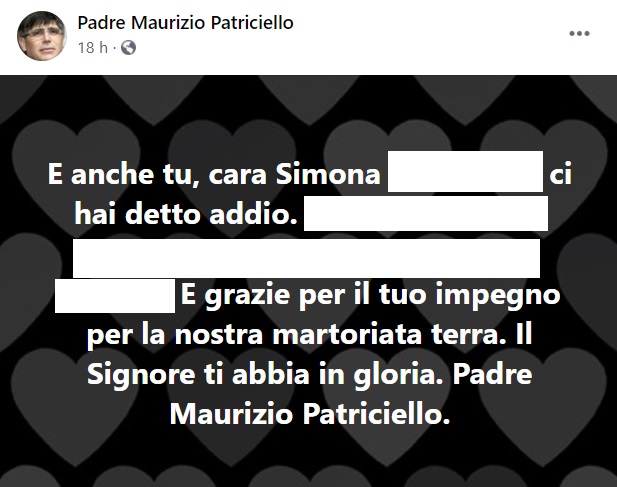 "E anche tu, cara Simona ... ci hai detto addio. ... E grazie- si legge nella nota- per il tuo impegno per la nostra martoriata terra. Il Signore ti abbia in gloria. Padre Maurizio Patriciello."