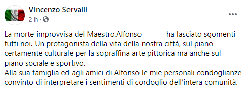 Questo parte del post pubblicato sulla sua pagina Facebook dal Sindaco di Cava de Tirreni Vincenzo Servalli: "La morte improvvisa del Maestro, Alfonso (...) ha lasciato sgomenti tutti noi. Un protagonista della vita della nostra città, sul piano certamente culturale per la sopraffina arte pittorica ma anche sul piano sociale e sportivo. Alla sua famiglia - si legge nel post - ed agli amici di Alfonso le mie personali condoglianze convinto di interpretare i sentimenti di cordoglio dell’intera comunità".