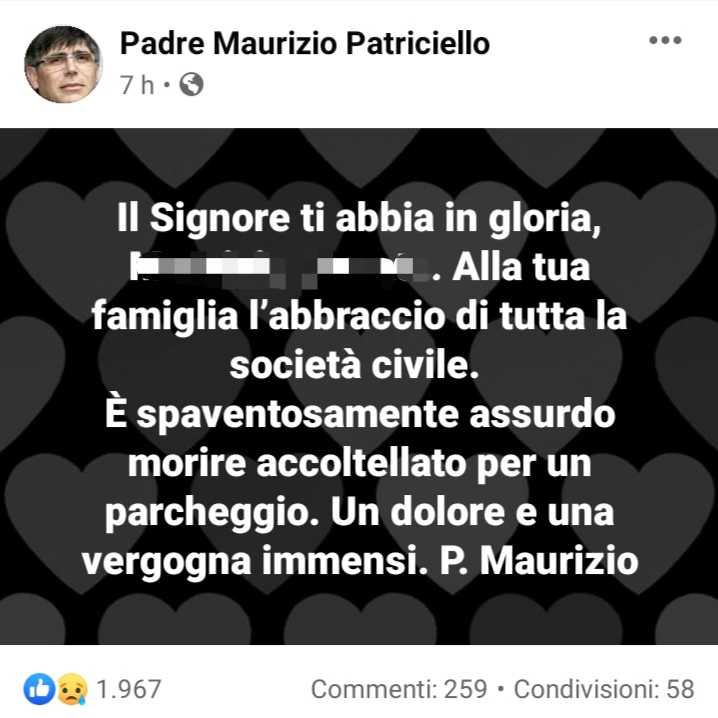 Questo il messaggio di cordoglio che apprendiamo dalla pagina facebook di Padre Maurizio Patriciello: "Il Signore ti abbia in gloria, ... Alla tua famiglia l’abbraccio di tutta la società civile. È spaventosamente assurdo morire accoltellato per un parcheggio. Un dolore ed una vergogna immensi. P. Maurizio"