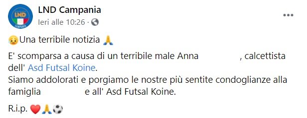 "Una terribile notizia. E' scomparsa a causa di un terribile male Anna ... , calcettista dell'Asd Futsal Koine. -Si legge nella nota- Siamo addolorati e porgiamo le nostre più sentite condoglianze alla famiglia ... e all'Asd Futsal Koine. R.i.p."