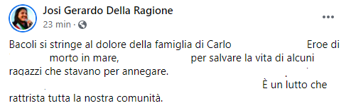 Questo parte del post pubblicato sulla sua pagina Facebook dal Sindaco di Bacoli Josi Jerardo Della Ragione: "Bacoli si stringe al dolore della famiglia di Carlo )...). Eroe (...), morto in mare (...) per salvare la vita - si legge nel post - di alcuni ragazzi che stavano per annegare (...). È un lutto che rattrista tutta la nostra comunità".