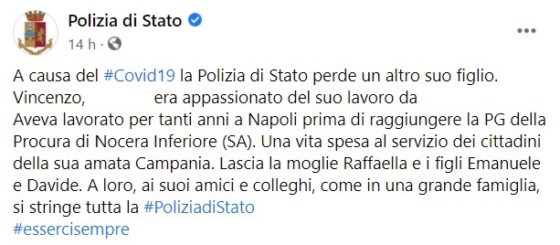 "A causa del #Covid19 la Polizia di Stato perde un altro suo figlio. Vincenzo, ... era appassionato del suo lavoro da ... Aveva lavorato per tanti anni a Napoli prima di raggiungere la PG della Procura di Nocera Inferiore (SA). Una vita spesa- si legge nella nota- al servizio dei cittadini della sua amata Campania. Lascia la moglie Raffaella e i figli Emanuele e Davide. A loro, ai suoi amici e colleghi, come in una grande famiglia, si stringe tutta la #PoliziadiStato"