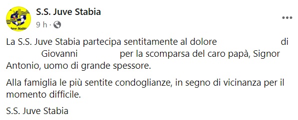 "La S.S. Juve Stabia partecipa sentitamente al dolore ... di ... Giovanni ... per la scomparsa del caro papà, Signor Antonio, uomo di grande spessore. Alla famiglia le più sentite condoglianze, in segno di vicinanza per il momento difficile. S.S. Juve Stabia"