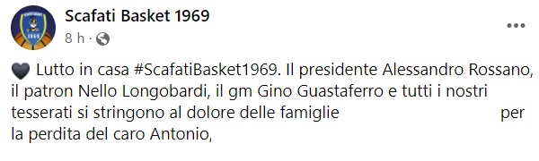 "Lutto in casa #ScafatiBasket1969. Il presidente Alessandro Rossano, il patron Nello Longobardi, il gm Gino Guastaferro e tutti i nostri tesserati si stringono al dolore delle famiglie ... per la perdita del caro Antonio..."