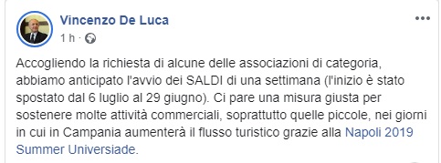 Questo il post pubblicato sulla pagina fb ufficiale del Presidente della Regione Campania Vincenzo De Luca.