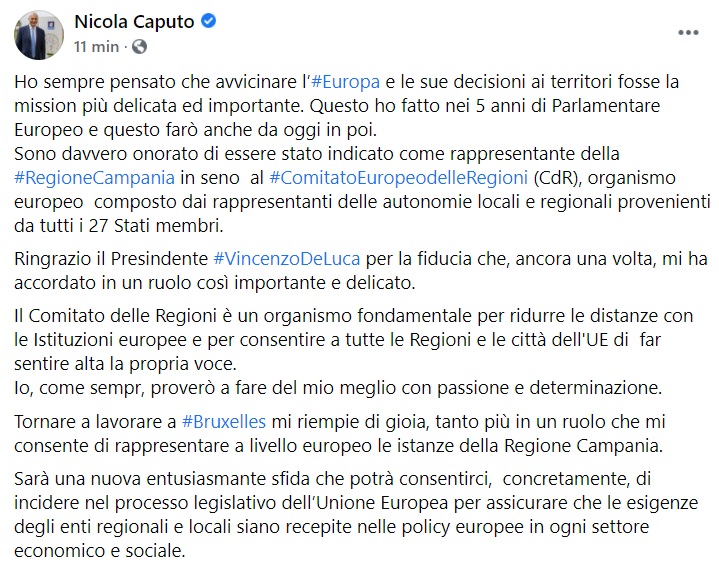 Questo qaunto apprendiamo dalla pagina fb dell'Ass. regionale Caputo: "Ho sempre pensato che avvicinare l’#Europa e le sue decisioni ai territori fosse la mission più delicata ed importante. Questo ho fatto nei 5 anni di Parlamentare Europeo e questo farò anche da oggi in poi. Sono davvero onorato di essere stato indicato come rappresentante della #RegioneCampania in seno al #ComitatoEuropeodelleRegioni (CdR), organismo europeo composto dai rappresentanti delle autonomie locali e regionali provenienti da tutti i 27 Stati membri. Ringrazio il Presindente #VincenzoDeLuca per la fiducia che, ancora una volta, mi ha accordato in un ruolo così importante e delicato. Il Comitato delle Regioni è un organismo fondamentale per ridurre le distanze con le Istituzioni europee e per consentire a tutte le Regioni e le città dell'UE di far sentire alta la propria voce. Io, come sempr, proverò a fare del mio meglio con passione e determinazione. Tornare a lavorare a #Bruxelles mi riempie di gioia, tanto più in un ruolo che mi consente di rappresentare a livello europeo le istanze della Regione Campania. Sarà una nuova entusiasmante sfida che potrà consentirci, concretamente, di incidere nel processo legislativo dell’Unione Europea per assicurare che le esigenze degli enti regionali e locali siano recepite nelle policy europee in ogni settore economico e sociale."