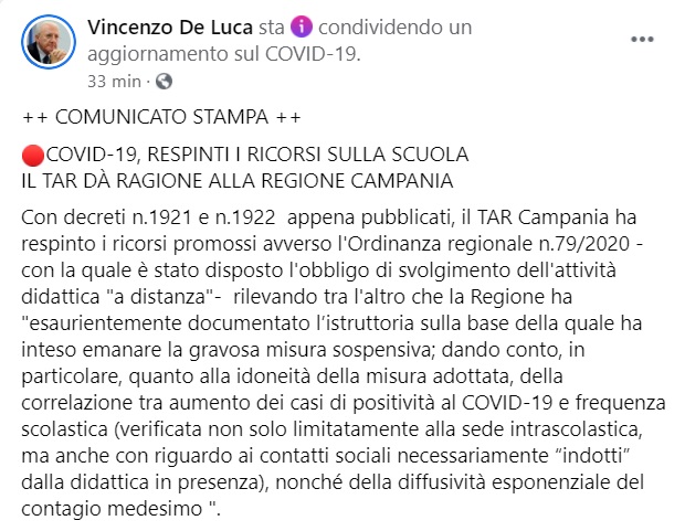 Questo quanto pubblicato sulla pagina facebook del Pres. De Luca:
