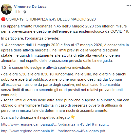 Questo il post pubblicato su Facebook dal Presidente della Regione Campania Vincenzo De Luca: