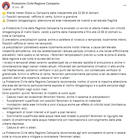 Questo il post pubblicato sulla pagina Facebook 'Protezione Civile Regione Campania': "Allerta meteo Gialla su Campania dalla mezzanotte alle 23.59 di domani. Possibili temporali, raffiche di vento, fulmini e grandine. Dissesto idrogeologico: attenzione ad aree interessate da incendi e ad elevata fragilità. La Protezione Civile della Regione Campania - si lgege nel post - ha emanato un avviso di allerta meteo con criticità idrogeologica di livello Giallo, valido a partire dalla mezzanotte e fino alle 23.59 di domani su tutta la Campania. Si prevedono precipitazioni sparse, anche a carattere di rovescio o temporale, localmente intensi. Possibili raffiche di vento nei temporali. Le precipitazioni - prosegue il post - potrebbero essere localmente anche molto intense, a causa dell'elevata instabilità atmosferica, che sta caratterizzando l'attuale periodo climatico%u200B e che rende difficilmente prevedibili, nello spazio e nel tempo, i fenomeni temporaleschi previsti su tutte le zone di allerta della regione e per tutta la durata dell'avviso. I rovesci e temporali attesi saranno caratterizzati da un'elevata rapidità di evoluzione e, anche in considerazione degli scenari meteo attuali, influenzati dal cambiamento climatico in atto anche nel Mediterraneo, potranno verificarsi in più punti del territorio, con contestuale verificarsi - si legge ancora - di grandinate, fulmini e raffiche di vento, fenomeni particolarmente pericolosi e tali da determinare possibili danni alle coperture, caduta di rami o alberi. La Protezione Civile della Regione Campania raccomanda, inoltre, di porre la massima attenzione alle aree del territorio particolarmente esposte al rischio idrogeologico e a quelle percorse dagli incendi verificatisi negli scorsi mesi. Sono possibili, quindi, fenomeni di impatto al suolo quali: - Caduta massi - prosegue il post - ed occasionali fenomeni franosi, anche in assenza di precipitazioni%u200B; - Ruscellamenti superficiali con possibili fenomeni di trasporto di materiale; - Inondazioni delle aree limitrofe a corsi d'acqua anche per effetto di criticità locali (tombature, restringimenti, ecc); - Allagamenti di locali interra%u200Bti e di quelli a pian terreno; - Scorrimento superficiale - continua il post - delle acque nelle sedi stradali e possibili fenomeni di rigurgito dei sistemi di smaltimento delle acque meteoriche con tracimazione e coinvolgimento delle aree urbane depresse; - Caduta di rami o alberi. La Protezione Civile della Regione Campania - conclude il post - raccomanda agli enti competenti di porre in essere tutte le misure atte a mitigare e contrastare i fenomeni attesi".