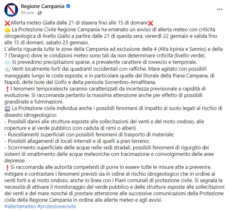 "La Protezione Civile Regione Campania ha emanato un avviso di allerta meteo con criticità idrogeologica di livello Giallo a partire dalle 21 di questa sera, venerdì 22 gennaio e valida fino alle 15 di domani, sabato 23 gennaio. L'allerta riguarda tutte le zone della Campania ad esclusione della 4 (Alta Irpinia e Sannio) e della 7 (Tanagro) dove le condizioni meteo sono tali da non determinare criticità (livello verde). -Si legge nella nota- Si prevedono precipitazioni sparse, a prevalente carattere di rovescio e temporale. Venti localmente forti dai quadranti occidentali con raffiche. Mare agitato con possibili mareggiate lungo le coste esposte, e in particolare quelle del litorale della Piana Campana, di Napoli, delle Isole del Golfo e della penisola Sorrentino-Amalfitana. I fenomeni temporaleschi saranno caratterizzati da incertezza previsionale e rapidità di evoluzione. Si raccomanda pertanto la massima attenzione anche per effetto di possibili grandinate e fulminazioni. La Protezione civile individua anche i possibili fenomeni di impatto al suolo legati al rischio di dissesto idrogeologico: