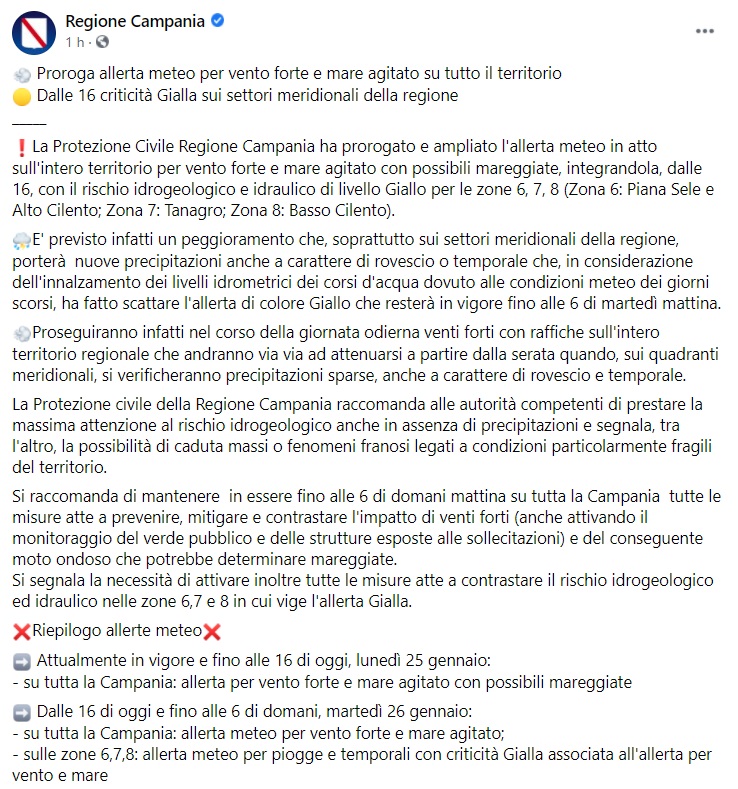 "La Protezione Civile Regione Campania ha prorogato e ampliato l'allerta meteo in atto sull'intero territorio per vento forte e mare agitato con possibili mareggiate, integrandola, dalle 16, con il rischio idrogeologico e idraulico di livello Giallo per le zone 6, 7, 8 (Zona 6: Piana Sele e Alto Cilento; Zona 7: Tanagro; Zona 8: Basso Cilento).%u200B E' previsto infatti un peggioramento che, soprattutto sui settori meridionali della regione, porterà nuove precipitazioni anche a carattere di rovescio o temporale che, in considerazione dell'innalzamento dei livelli idrometrici dei corsi d'acqua dovuto alle condizioni meteo dei giorni scorsi, ha fatto scattare l'allerta di colore Giallo che resterà in vigore fino alle 6 di martedì mattina. -Si legge nella nota- Proseguiranno infatti nel corso della giornata odierna venti forti con raffiche sull'intero territorio regionale che andranno via via ad attenuarsi a partire dalla serata quando, sui quadranti meridionali, si verificheranno precipitazioni sparse, anche a carattere di rovescio e temporale. La Protezione civile della Regione Campania raccomanda alle autorità competenti di prestare la massima attenzione al rischio idrogeologico anche in assenza di precipitazioni e segnala, tra l'altro, la possibilità di caduta massi o fenomeni franosi legati a condizioni particolarmente fragili del territorio. -Si legge nella nota- Si raccomanda di mantenere in essere fino alle 6 di domani mattina su tutta la Campania tutte le misure atte a prevenire, mitigare e contrastare l'impatto di venti forti (anche attivando il monitoraggio del verde pubblico e delle strutture esposte alle sollecitazioni%u200B) e del conseguente moto ondoso che potrebbe determinare mareggiate. Si segnala la necessità di attivare inoltre tutte le misure atte a contrastare il rischio idrogeologico ed idraulico nelle zone 6,7 e 8 in cui vige l'allerta Gialla. Riepilogo allerte meteo.
