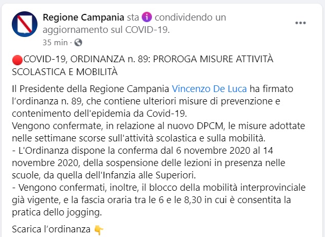 Questo quanto pubblicato sulla pagina FB della Regione Campania
