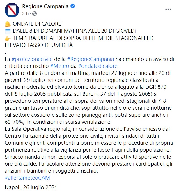 "La #protezionecivile della #RegioneCampania ha emanato un avviso di criticità per rischio #Meteo da #ondatedicalore. A partire dalle 8 di domani mattina, martedì 27 luglio e fino alle 20 di giovedì 29 luglio nei comuni del territorio regionale classificati a rischio moderato ed elevato (come da elenco allegato alla DGR 870 dell'8 luglio 2005 pubblicata sul Burc n. 37 del 1 agosto 2005) si prevedono temperature al di sopra dei valori medi stagionali di 7-8 gradi e un tasso di umidità che, -si legge nella nota- soprattutto nelle ore serali e notturne sul settore costiero e sulle zone pianeggianti, potrà superare anche il 60-70%, in condizioni di scarsa ventilazione. La Sala Operativa regionale, in considerazione dell'avviso emesso dal Centro Funzionale della protezione civile, -si legge nella nota- invita i sindaci di tutti i Comuni e gli enti competenti a porre in essere le procedure di propria pertinenza relative alla vigilanza per le fasce fragili della popolazione. Si raccomanda di non esporsi al sole o praticare attività sportive nelle ore più calde. Particolare attenzione devono prestare i cardiopatici, gli anziani, i bambini e i soggetti a rischio."