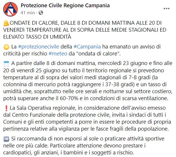Questo quanto apprendiamo dalla pagina fb della Prot. Civile Reg. Campania: "ONDATE DI CALORE, DALLE 8 DI DOMANI MATTINA ALLE 20 DI VENERDì TEMPERATURE AL DI SOPRA DELLE MEDIE STAGIONALI ED ELEVATO TASSO DI UMIDITÀ