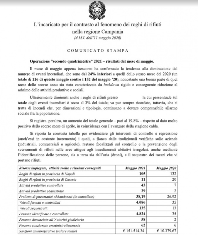 Questa parte della nota stampa dell'incaricato per il contrasto al fenomeno dei roghi di rifiuti nella regione Campania: