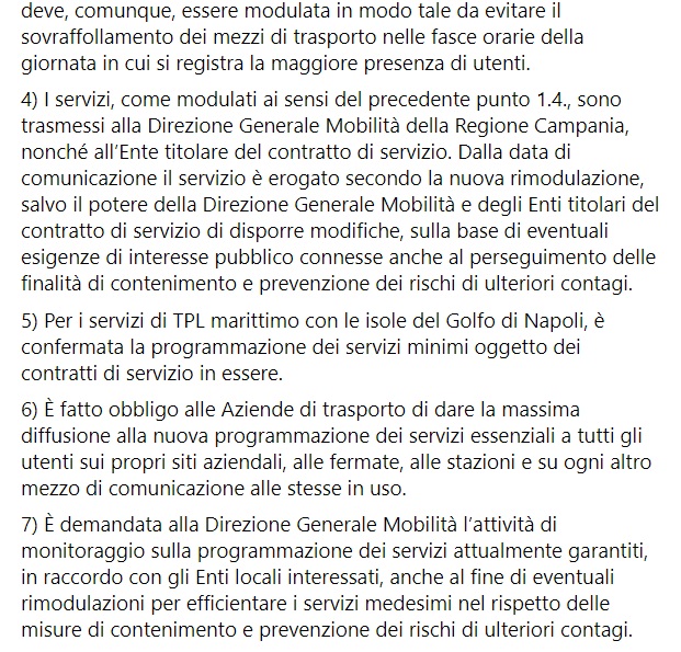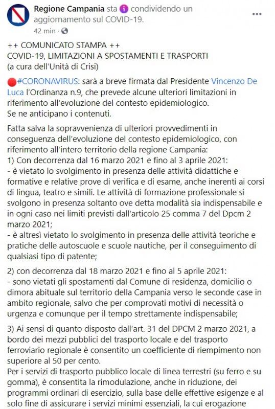 "COVID-19, LIMITAZIONI A SPOSTAMENTI E TRASPORTI (a cura dell’Unità di Crisi) #CORONAVIRUS: sarà a breve firmata dal Presidente Vincenzo De Luca l’Ordinanza n.9, che prevede alcune ulteriori limitazioni in riferimento all'evoluzione del contesto epidemiologico. Se ne anticipano i contenuti. Fatta salva la sopravvenienza di ulteriori provvedimenti in conseguenza dell’evoluzione del contesto epidemiologico, con riferimento all’intero territorio della regione Campania: 1) Con decorrenza dal 16 marzo 2021 e fino al 3 aprile 2021: - è vietato lo svolgimento in presenza delle attività didattiche e formative e relative prove di verifica e di esame, anche inerenti ai corsi di lingua, teatro e simili. -Si legge nella nota- Le attività di formazione professionale si svolgono in presenza soltanto ove detta modalità sia indispensabile e in ogni caso nei limiti previsti dall'articolo 25 comma 7 del Dpcm 2 marzo 2021; - è altresì vietato lo svolgimento in presenza delle attività teoriche e pratiche delle autoscuole e scuole nautiche, per il conseguimento di qualsiasi tipo di patente; 2) con decorrenza dal 18 marzo 2021 e fino al 5 aprile 2021: - sono vietati gli spostamenti dal Comune di residenza, domicilio o dimora abituale sul territorio della Campania verso le seconde case in ambito regionale, salvo che per comprovati motivi di necessità o urgenza e comunque per il tempo strettamente indispensabile; 3) -Si legge nella nota- Ai sensi di quanto disposto dall’art. 31 del DPCM 2 marzo 2021, a bordo dei mezzi pubblici del trasporto locale e del trasporto ferroviario regionale è consentito un coefficiente di riempimento non superiore al 50 per cento. Per i servizi di trasporto pubblico locale di linea terrestri (su ferro e su gomma), è consentita la rimodulazione, anche in riduzione, dei programmi ordinari di esercizio, sulla base delle effettive esigenze e al solo fine di assicurare i servizi minimi essenziali, la cui erogazione deve, comunque, essere modulata in modo tale da evitare il sovraffollamento dei mezzi di trasporto nelle fasce orarie della giornata in cui si registra la maggiore presenza di utenti. 4) I servizi, come modulati ai sensi del precedente punto 1.4., sono trasmessi alla Direzione Generale Mobilità della Regione Campania, nonché all’Ente titolare del contratto di servizio. Dalla data di comunicazione il servizio è erogato secondo la nuova rimodulazione, salvo il potere della Direzione Generale Mobilità e degli Enti titolari del contratto di servizio di disporre modifiche, sulla base di eventuali esigenze di interesse pubblico connesse anche al perseguimento delle finalità di contenimento e prevenzione dei rischi di ulteriori contagi.-Si legge nella nota- 5) Per i servizi di TPL marittimo con le isole del Golfo di Napoli, è confermata la programmazione dei servizi minimi oggetto dei contratti di servizio in essere. 6) È fatto obbligo alle Aziende di trasporto di dare la massima diffusione alla nuova programmazione dei servizi essenziali a tutti gli utenti sui propri siti aziendali, alle fermate, alle stazioni e su ogni altro mezzo di comunicazione alle stesse in uso. 7) È demandata alla Direzione Generale Mobilità l’attività di monitoraggio sulla programmazione dei servizi attualmente garantiti, in raccordo con gli Enti locali interessati, anche al fine di eventuali rimodulazioni per efficientare i servizi medesimi nel rispetto delle misure di contenimento e prevenzione dei rischi di ulteriori contagi."