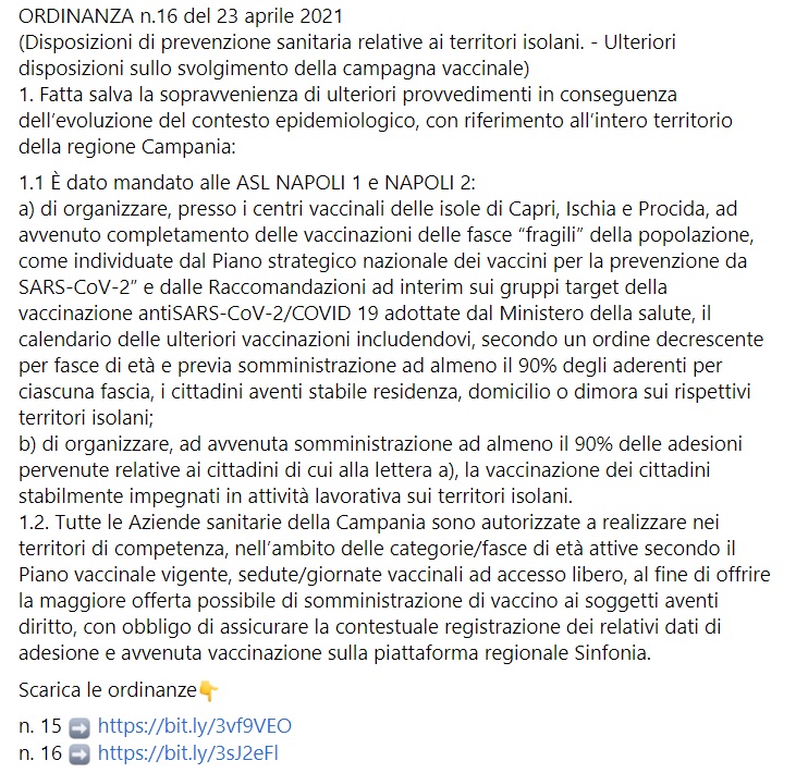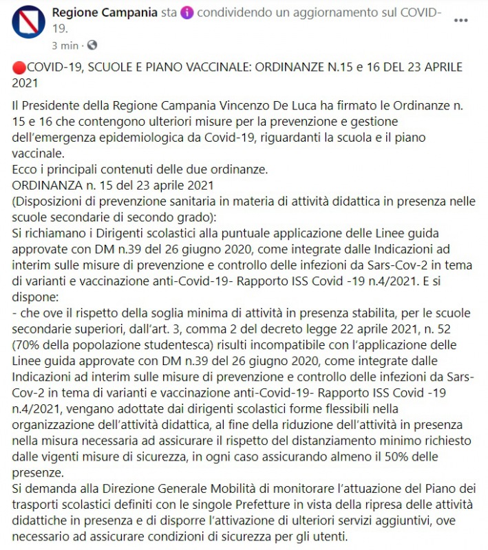 Questo quanto pubblicato sulla pagina facebook della Regione Campania: