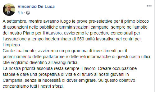 Questo il post pubblicato su Facebook dal Presidente della Regione Campania Vincenzo De Luca: