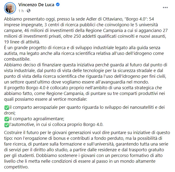 "Abbiamo presentato oggi, presso la sede Adler di Ottaviano, “Borgo 4.0”: 54 imprese impegnate, 3 centri di ricerca pubblici che coinvolgono le 5 università campane, 46 milioni di investimenti della Regione Campania a cui si agganciano 27 milioni di investimenti privati, oltre 250 addetti qualificati coinvolti e nuovi assunti, 19 linee di attività. È un grande progetto di ricerca e di sviluppo industriale legato alla guida senza autista, ma legato anche alla ricerca scientifica relativa all'uso dell'idrogeno come combustibile. -Si legge nella nota- Abbiamo deciso di finanziare questa iniziativa perché guarda al futuro dal punto di vista industriale, dal punto di vista delle tecnologie per la sicurezza stradale e dal punto di vista della ricerca scientifica che riguarda l'uso dell'idrogeno per fini civili, un settore quest’ultimo dove vogliamo essere all'avanguardia nel mondo. Il progetto Borgo 4.0 è collocato proprio nell'ambito di una scelta strategica che abbiamo fatto, come Regione Campania, di puntare su tre comparti produttivi nei quali possiamo essere al vertice mondiale: il comparto aerospaziale per quanto riguarda lo sviluppo dei nanosatelliti e dei droni; il comparto agroalimentare; l'automotive, in cui si colloca proprio Borgo 4.0. -Si legge nella nota- Costruire il futuro per le giovani generazioni vuol dire puntare su iniziative di questo tipo: non l’erogazione di bonus e contributi a fondo perduto, ma la possibilità di fare ricerca, di puntare sulla formazione e sull’università, garantendo tutta una serie di servizi per il diritto allo studio, a partire dalle residenze e dal trasporto gratuito per gli studenti. Dobbiamo sostenere i giovani con un percorso formativo di alto livello che li metta nelle condizioni di essere al passo in un mondo altamente competitivo."