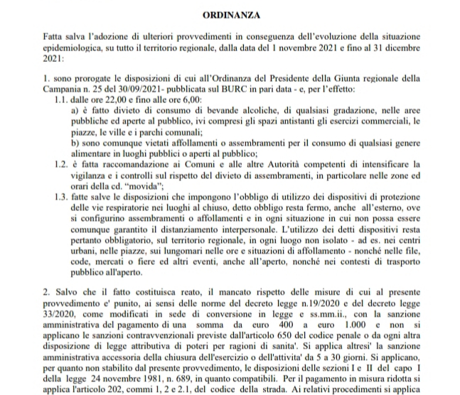 Questa la nuova ordinanza firmata dal presidente Vincenzo De Luca: "Fatta salva l’adozione di ulteriori provvedimenti in conseguenza dell’evoluzione della situazione epidemiologica, su tutto il territorio regionale, dalla data del 1 novembre 2021 e fino al 31 dicembre 2021: